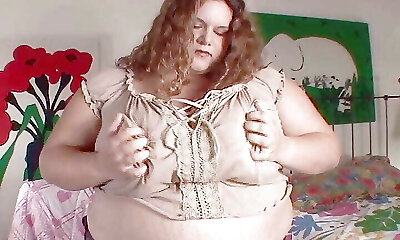 plus-size-frau kreuzt und zeigt ihre riesigen titten und ihren riesigen bauch