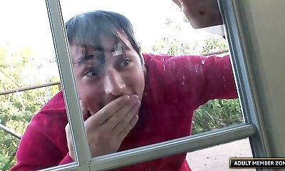 The red railing hood Brind Enjoy gets banged by woodcutter outdoors